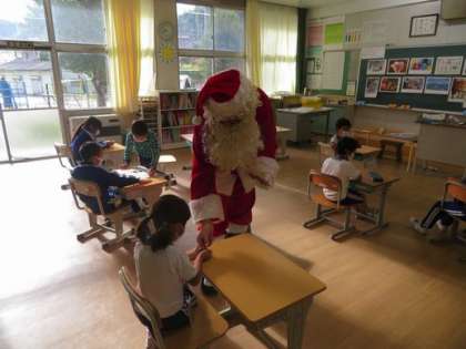 本日、ALTの先生がサンタクロースの変装をしてクリスマスの授業を行ってくれました。子どもたちは大喜び!最後にシールのプレゼントをもらってうれしそうでした。