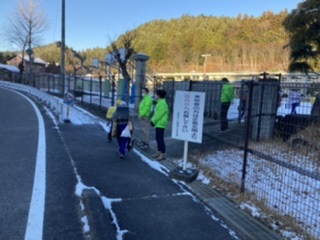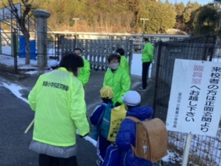 今日から学校が始まりました。朝早くから民生児童委員さんたちが立哨指導をしてくださりました。朝から元気いっぱいの敷島っ子たちです。