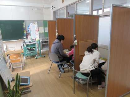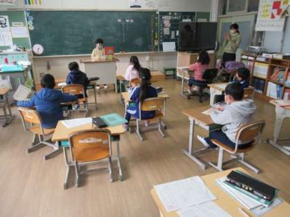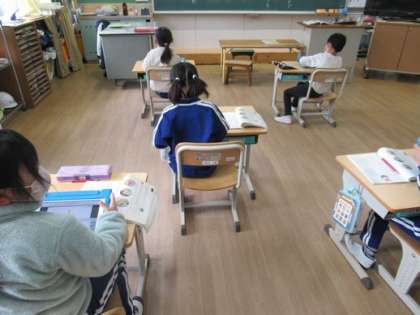 朝から雪が舞っています。1時間目に教室をまわっていると1階の教室で授業に集中する姿がありました。さくら学級は算数の問題に取り組み、1年生は物語を作り、2年生は自分の読んだ本をみんなの前で紹介していました。