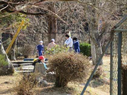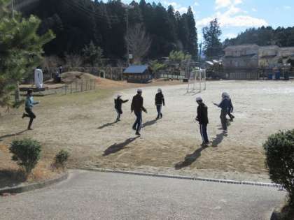 太陽の時間、子どもたちは溶けてない運動場の場所でなわとびをしたり、丸池の氷で遊んだりと元気いっぱい外で遊んでいます。