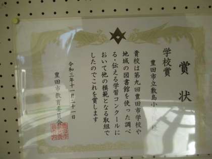 本日の放送全校朝会の表彰で体力賞、赤十字リーダーシップの表彰とともに学校賞をもらった「調べ・伝える学習コンクール」を全校に伝えました。学校のみんなががんばったということで教室からは歓声が聞こえました。