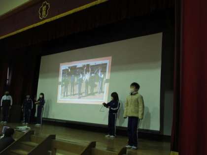 3年生は6年生の思いでクイズ、4年生はけん玉の演技を披露しながらメッセージを送りました。5年生はすてきな6年間の思い出をスライドにまとめてくれました。6年生はそれを見て6年間を振り返っていました