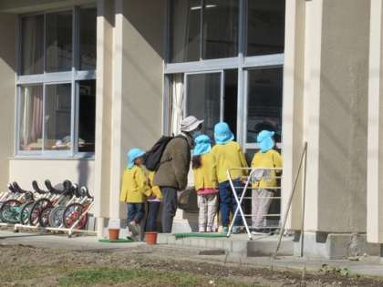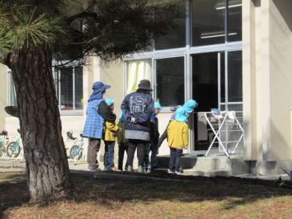 普段ならばこども園の子どもたちが、学校の校舎や授業の様子を見ていたのですが、まん延防止措置が出ていることから、外からのみの見学にしました。こども園の子どもたちは1,2年生の授業の様子を静かに見ていました。