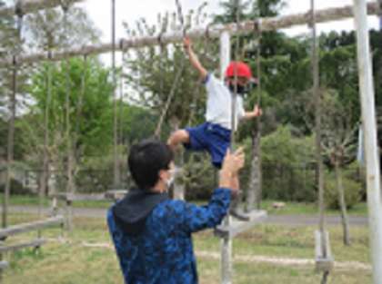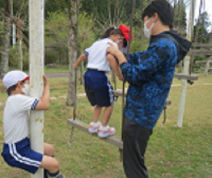 1・2年生が、4時間目の体育の授業で、運動場にある遊具「猿渡り」に挑戦しました。子どもたちは、先生に補助してもらいながら、必死にバランスを取りながら1歩ずつ頑張って進んでいました。