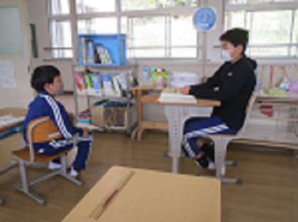 5年生は、国語の物語文「だいじょうぶ だいじょうぶ」において、おじいさんの気持ちを想像して音読を工夫する学習をしました。子どもたちは、ペアに向かって、おじいさんになり切って「だいじょうぶ、だいじょうぶ」と優しく笑顔で音読していました。