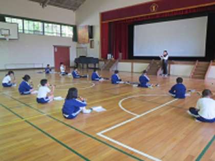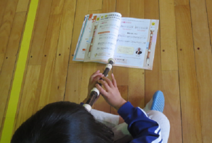 3・4年生が、音楽の授業でリコーダーの練習をしました。コロナ感染症対策として、音楽室よりも広い体育館で子ども同士の間隔を十分に空けて行いました。「ラ」の音を出すにはどの指でどの穴を押さえればよいかを確かめ、指を器用に動かして、きれいな音を出すことができていました。