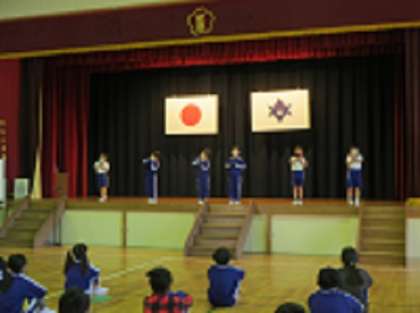 1・4年生が、朝の全校集会で、国語で学習したお話の音読発表を行いました。1年生は「あいうえおのうた」、4年生は「こわれた千の楽器」を発表しました。1年生は元気よくはきはきと、4年生は抑揚をつけながら聞き取りやすい声で音読していました。
