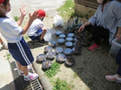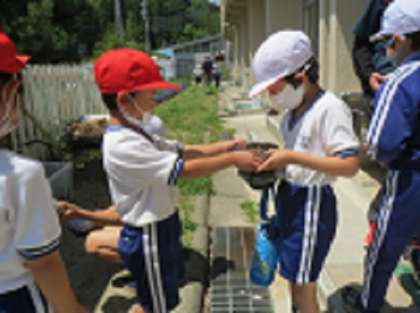 地域の方からのご厚意で、たくさんのカブトムシの幼虫をいただきました。1年生たちが、土を入れたパックに幼虫を3匹ずつ小分けして、全校放送で育ててみたい人を呼びかけたところ、たくさんの希望者が集まっていました。立派なカブトムシに育つのが楽しみです!