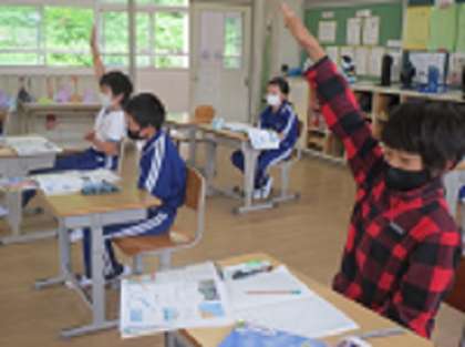 5年生は、社会の授業で、日本の梅雨や台風の特徴について学習しました。教科書の資料を見て気づいたことを積極的に出し合いながら、雨の量が季節や地域によって異なることを学んでいました。