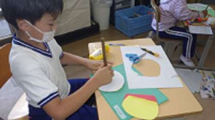 3年生が図工の授業で、割りピンを使って紙をくるくる回すことで表現したい世界を作る「くるくるランドに取り組んでいます。子どもたちは「うーん、この部分はどうしようかな〜」と試行錯誤しながらも、楽しそうに作品作りに浸っていました。