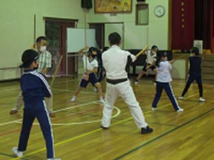 朝の活動の時間に、全校で棒の手練習を行いました。本日は雨のため、体育館と音楽室に分かれて練習しました。講師の方が子どもたちに対し、膝をどれぐらい曲げるか、目線をどこに向けるか、といった細かい部分まで教えてくださったおかげで、子どもたちの立ち振る舞いがぐっとかっこよくなってきました。