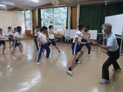 本日、朝の活動の時間に、地域講師をお招きして棒の手練習を行いました。あいにくの雨でしたので、各流派が体育館や音楽室に分かれて活動しました。6年生が、大きな声で「ひざを曲げてもっと腰を低くするよ!」と下級生の子に向かって呼びかける姿が見られ、演技をしながらも下級生の様子をよく見てアドバイスしている6年生に頼もしさを感じました。