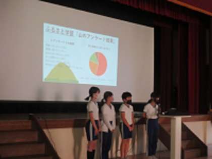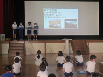 全校朝会において、3年生と6年生が、総合的な学習の時間で調べたことを全校に発表しました。3年生は豊田市内の人気スポットを紹介し、6年生は旭地区の山や川に関するアンケート結果を発表しました。どちらの学年も、学習用タブレットを使ってわかりやすく発表しており、この日のためにしっかり準備してきたことが伝わってきました。