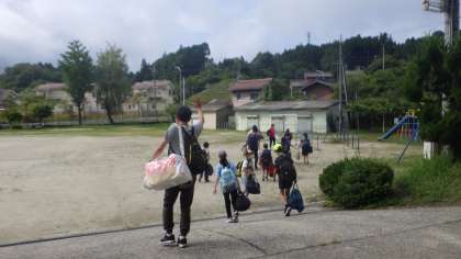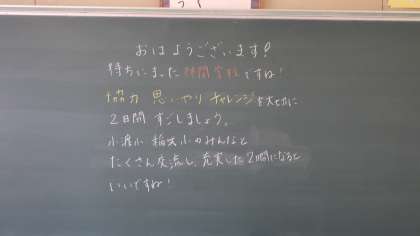 昨夜の雨雲が去り、5年生が待ちに待った林間学校に出発しました。担任のメッセージの言葉の通り、充実した2日間になることを願っています。5年生が児童玄関で「行ってきます」のあいさつをすると、全校のみんなが「行ってらっしゃい!」と笑顔で見送りました。いつもなかよしの敷島っ子です。