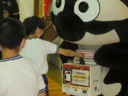 本日、不要な携帯電話のリサイクル活動をしている名古屋グランパスの職員と「グランパスくん」を招き、携帯電話の回収活動を行いました。この活動は、SDGs(持続可能な開発目標)の一環として行っており、回収された携帯電話を再利用することを目的としています。子どもたちは、グランパスくんと出会って大喜びしており、最後に一緒に記念撮影をしました。携帯電話の回収にご協力くださった方々、大変ありがとうございました。