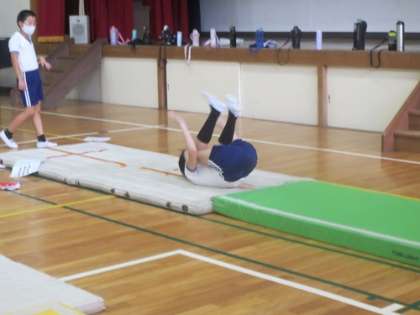 5・6年生が、体育の授業でマット運動を行いました。頭倒立、側方倒立回転などを練習した後、自分ができる技の組み合わせを考え、練習しました。子どもたちは、納得のいく演技をめざしていろいろな組み合わせを何度も頑張って試していました。
