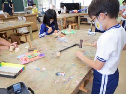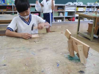 3年生が図工の授業で、金づちを使って木に釘を打ち、いろいろな形を作る活動を行いました。釘を打つことが初めての子もおり、釘で木が割れてしまったり、釘が曲がってしまったりして苦戦する姿もありましたが、子どもたちは、釘の長さや木の形を生かして思い思いに作品作りを楽しんでいました。