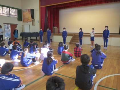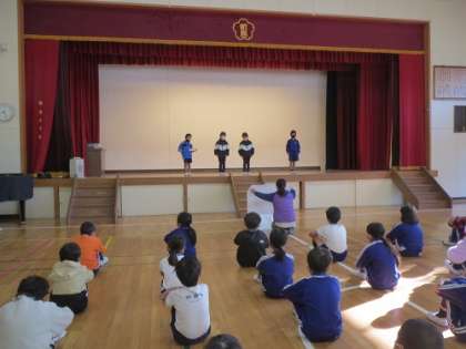 朝の活動の時間に、全校朝会を行いました。はじめに、1年生の国語で学習した「曜日と日づけ」の特別な読み方を、タンバリンで拍子を取りながらリズムよく元気に発表しました。次に、運動会練習を引っ張ってきた6年生一人一人が、運動会で頑張ったことを全校児童に向けて発表しました。「仲間への感謝」「全力を出すことの大切さ」「地域に『元気』を届けることができた」など、真剣に取り組んできたからこその実感のこもった思いを自分の言葉で語ることができ、頼もしく感じました。