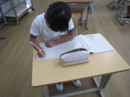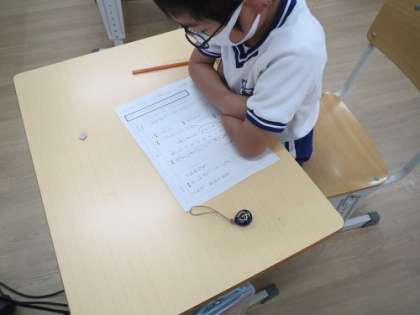 2年生が国語の授業で、自分の宝物を紹介するための文章を考えました。子どもたちは、キーホルダーや犬のぬいぐるみなどといった宝物のどんなところがお気に入りなのか、「はじめ」「なか」「おわり」の構成を意識して書いていました。宝物の文を考えている時の子どもたちの表情は、真剣そのものでした。