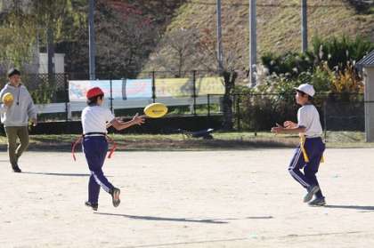 5・6年生が体育の授業でタグラグビーを行いました。はじめにボールに回転をかけたパスの仕方を練習し、後半はミニゲームを行いました。トライが決まる度に、運動場に子どもたちの歓喜の声が響き渡っていました。