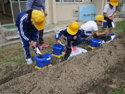 1年生が生活科の授業で、チューリップの球根を植えました。子どもたちは、赤、ピンク、白、黄色から好きなチューリップの色の球根を2色ずつ選び、自分の植木鉢に植えました。子どもたちは、あたたかな春にきれいな花を咲かせてくれることを期待して、うれしそうに植えていました。