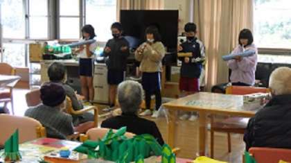 4年生が、老人福祉センター「ぬくもりの里」に出向き、高齢者の方々と交流しました。子どもたちは、この日のために頑張って計画してきた成果を発揮し、楽器演奏を披露したり、自作の「魚釣りゲーム」をしたりしました。施設の方々が子どもたちをとても温かく迎え入れてくださり、ふれあいを楽しむことができました。