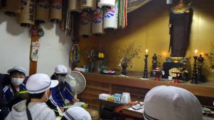 3年生が「総合的な学習の時間」の授業で、東萩平町の地蔵堂を訪ねました。地域講師よりお地蔵様の由来や功徳のお話を伺いました。守り継がれている地域の昔を直接見聞きし、学びを深めました。