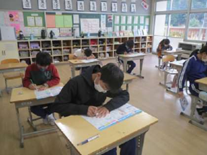 5年生が、年賀状の書き方を学習しました。宛て名や文章の書き方の見本を参考にしながら、1文字ずつゆっくり丁寧に書きました。届ける相手は、先生や下級生の子が多く、はがきには相手への感謝や励ましのあたたかい言葉が綴られていました。