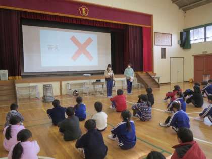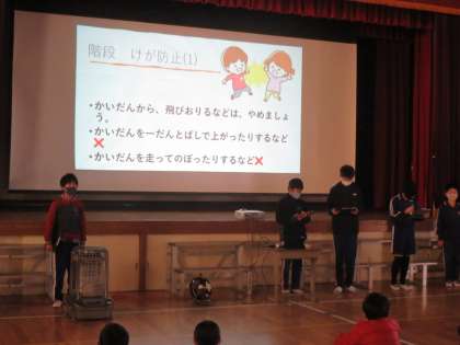 朝の活動の時間に、全校で冬休み明け前集会を行いました。集会では、校長講話の後、5年生が全校児童に向けて「安全な学校生活の過ごし方」について発表しました。休み明けすぐの発表ということもあり、5年生は緊張気味でしたが、パワーポイントを使って分かりやすく説明できました。