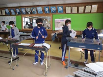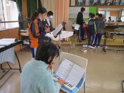 5・6年生が、音楽の授業で器楽の合奏を練習中です。曲は「風を切って」で、木琴、鉄琴、電子オルガン、リコーダーなどのさまざまな楽器を分担して担当し、強弱や速さを意識して曲想豊かに演奏できるよう練習に励んでいました。