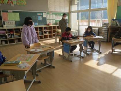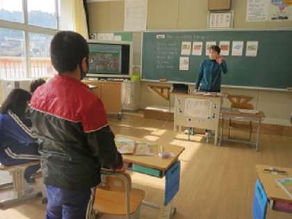 4年生が外国語活動「This is my favorite place.」の授業で、英語による教室の説明をよく聞き取って、学校内のどの教室について説明しているのか考えました。子どもたちは、友達が聞き取った英単語をつなぎ合わせ、協力して正解を導いていました。