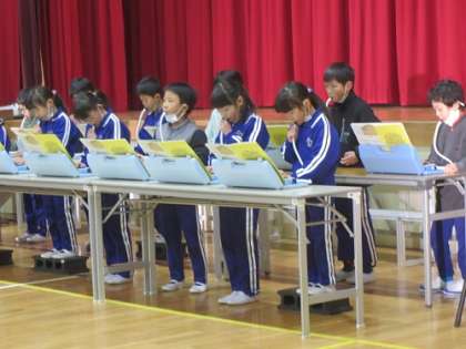 1/26(木) 「学習発表会 〜全校〜」 公開日 2023/01/26 更新日 2023/01/26 お知らせ 本日の午前中、学習発表会を開催しました。全校児童による校歌の合唱からスタートしたあと、各学年が体育館や教室などに分かれて学習発表を行いました。子どもたちは、おうちの方々に参観されて緊張しながらも、これまで練習してきた成果をしっかりと発揮できました。発表を終えた子どもたちは、やり切った達成感を仲間と味わうことができました。 ご参観いただいた保護者の皆様、ありがとうございました。