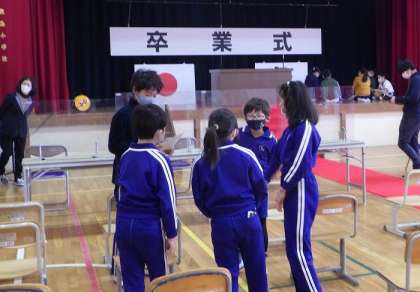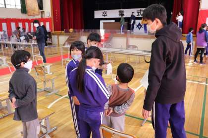 1〜5年生が縦割り班に分かれ、卒業式での「送る言葉」を練習しました。各縦割り班の班長として頑張ってくれた6年生に感謝の気持ちを伝えるため、各班の5年生が中心となって言葉の速さや抑揚を工夫しながら練習しました。練習を重ねるにつれ、言葉一つ一つに気持ちが込められていき、在校生らの真剣さが伝わってきました。