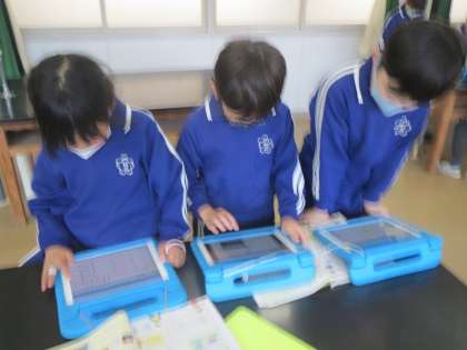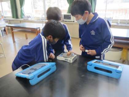 3年生が理科の授業で、ものの体積が同じなら重さも同じかどうかを計測しました。子どもたちは、同じ体積である木や鉄、アルミニウム、プラスチックの4種類の重さをそれぞれ計測し、結果をタブレットにまとめました。