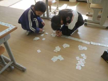 1年生が算数の授業で、1から100までのカードを順に並べながら数を覚えました。100枚のカードをテープでつなぎ合わせるのは時間がかかりましたが、友達と協力し合って完成させることができました。出来上がった長いカードを見ながら、うれしそうに数を数える子どもたちの姿が見られました。