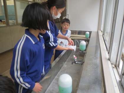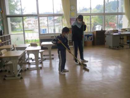 4/12「6年生 掃除を教える」 公開日 2023/05/27 更新日 2023/05/27 お知らせ 本校では、縦割り班で教室等の掃除を行っています。今日、6年生が5年生の時に家庭科の授業で作成したパワーポイント「正しい掃除の仕方」を活用して、縦割り班の仲間に掃除の仕方を教えました。班長の6年生は、雑巾の絞り方や机の拭き方などを実際にやって見せ、1年生にもわかるように優しく丁寧にアドバイスしていました。その姿から、最高学年としての6年生の自覚の高さを感じました。
