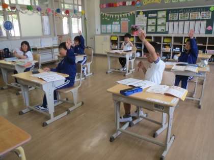 1年生が、算数の授業で「5までのかず」を学習しました。教科書の絵を見て、鉛筆や車がいくつあるかを数えてノートに数字を書きました。子どもたちは元気よく手を挙げて発言しており、学習を楽しんでいる様子が伝わってきました。