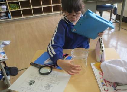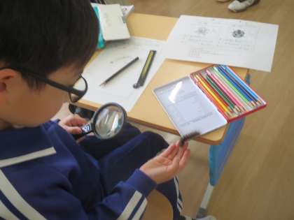 3年生が、理科の授業で、校庭で見つけた春の生き物を観察しました。子どもたちは、毛虫、ダンゴムシ、タンポポなどを教室に持ち込み、虫メガネで見ながらスケッチしました。子どもたちの生き物を見る目は真剣そのもので、生き物の特徴をたくさん発見していました。