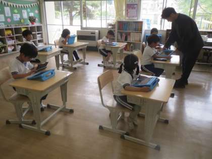 1年生が、国語の授業でひらがなを書く練習を行いました。子どもたちは、学習用タブレットにある学習アプリ「なぞっておぼえる ひらがなカタカナ」を使い、画面に表示されたひらがなを人差し指でなぞり、書き方を覚えていきました。子どもたちは、ゲーム感覚で覚えていけるところに面白さを感じ、夢中になって取り組んでいました。