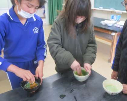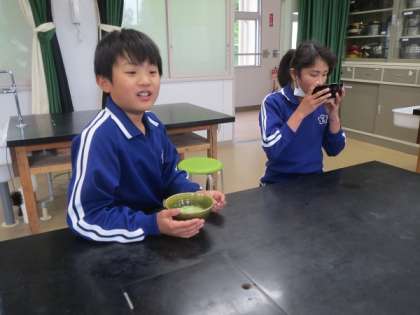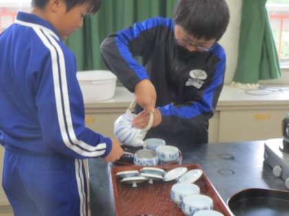 4/26「抹茶点てに挑戦!」 公開日 2023/05/27 更新日 2023/05/27 お知らせ 5年生が家庭科の授業で、お茶を入れる実習を行いました。お茶を正しく入れる方法を学んで実践した後は、茶筅(ちゃせん)を使って抹茶を点(た)てることにも挑戦しました。なかなか泡立たずに苦戦しましたが、初めて自分が点てた抹茶を飲んで「苦い!」と言いながらも、とても満足気な表情をしていました。