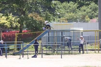 さわやかな青空の下、子どもたちは、休み時間になると校庭に出て楽しく過ごしています。
