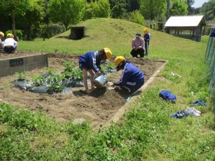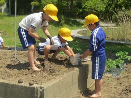 1年生が生活科の授業で、土と水を使って遊びました。子どもたちは、丸池から汲んできた水を土に流して川を作ったり、水に湿らせた土を握って固めてだんごを作ったりと、どんどん遊びを発見し、遊びに夢中になっていました。