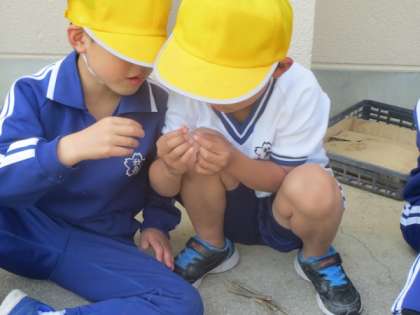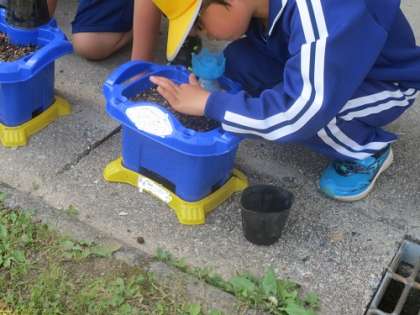 1年生が、生活科の授業で野菜の種を植えました。先日に種をまいたアサガオが芽を出しているのを見て大喜びした子どもたちが、今度はトウモロコシやインゲンの種をまきました。野菜の種類によって色や形が違う種を興味津々に見ていました。