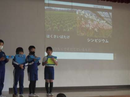 全校朝会で、4年生がふるさとの旭地区について調べていることを発表しました。旭地区の地理的な特徴、産業、交通などについて、パワーポイントを使って分かりやすく説明しました。4年生は、次の活動では「旭地区の観光大使」をめざして、旭の魅力についてさらに調べていきます。次の発表が楽しみです!