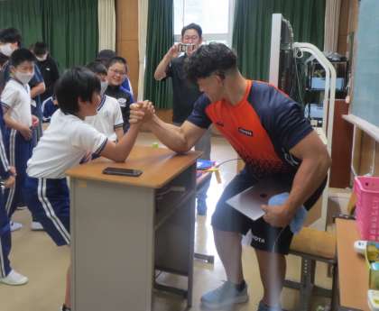 今日は、障がい者スポーツのアスリート(陸上:円盤投げ選手)の湯上剛輝さんをお招きし、5・6年生を対象に「パラアスリート教室」を行いました。前半の講話では、湯上選手の経験談を交えながら「出会いや縁を大切にすること」「真正面から自分に向き合うこと」を語っていただき、子どもたちは真剣に聞き入っていました。