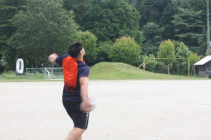講話の後、運動場に行き、湯上選手に円盤投げを披露していただきました。軽々と遠くに円盤を投げる姿を見て、子どもたちは大きな歓声を上げて喜んでいました。