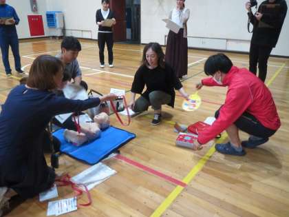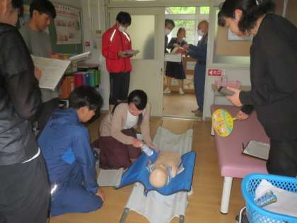 6/12「熱中症対応シミュレーション研修 〜教職員〜」 公開日 2023/06/12 更新日 2023/06/12 お知らせ 児童下校後、足助消防署員の方々を招き、全教職員で熱中症対応のシミュレーション研修を行いました。前半は、体育館でAED心配蘇生法を行いました。後半は、実際に熱中症おn疑いが発生した場合の対応シミュレーションを訓練し、その様子を観察された消防署員の方から指導・助言を受けました。今回の研修を生かし、教職員の危機管理意識を高めて日々の熱中症予防に努めていきます。