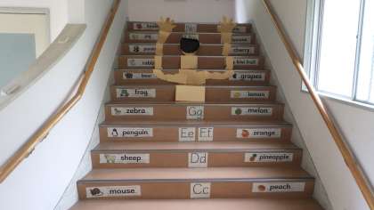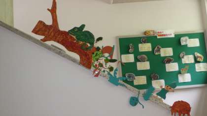 3・4時間目の図工の授業に、6年生が、校舎の奥行きや形の特徴を生かして、あちらこちらに「楽しく見えるもの」をつくりました。休み時間になり、廊下や階段の作品に気付いた下級生が、「お〜!」と歓声を上げました。そっと見ていた6年生が嬉しそうに笑っていました。