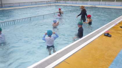 5時間目に1・2年生がプールに入りました。今年初めての水泳学習のため、着替え方、体操の仕方、シャワーの使い方…などを一つ一つ覚えました。子どもたちは笑顔いっぱいに水慣れ遊びを楽しみ、「水が冷たかったけど楽しかった」「もぐれて嬉しかった」と感想を話しました。