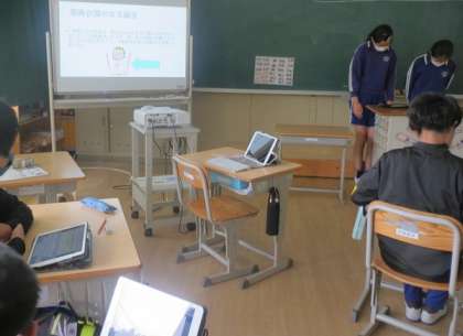 6年生が社会科の授業で、弥生時代について調べたことを発表しました。これまで、子どもたちは「弥生時代の衣食住」、「村から国への変化」、「強大な権力をもった人物」の3つのテーマごとにグループを作り、調べたことをパワーポイントにまとめてきました。子どもたちは、グループの仲間と役割分担しながら、わかりやすく発表することができました。